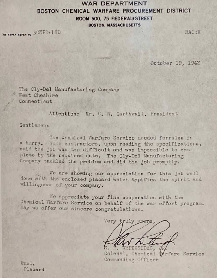Cly-Del helped to supply the U.S. with war-related drawn metal parts and components for the department of defense. By establishing and exceeding quality standards, Cly-Del converted the company’s production capabilities to meet military requirements.